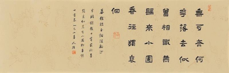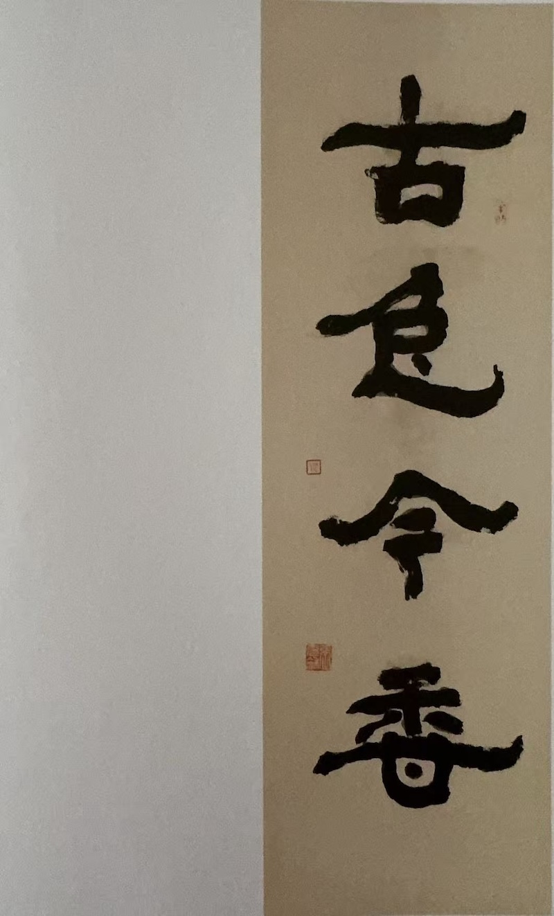 遗憾的是与这位前辈缘悭一面。2015年9月底,我作为香港北山堂基金会资助的“利荣森纪念访问学人”赴耶鲁大学美术馆访学一年。彼时,充和先生已仙逝三月有余。我于10月2日参加了耶鲁为她举办的追思会,主题为“古色今香:纪念张充和”Fragrance of the Past: Remembering Ch’ung-ho Chang Frankel(1913—2015)。屏幕上出现的中文是先生的题字,带有古意的楷书生动传神,似乎让人感受到隐在字后的先生身着旗袍的优雅身影。巧合的是,耶鲁美术馆1988年曾举办“古色今香”展览,展出居住在纽约的五位华裔画家的作品。时任馆长兼亚洲艺术部主任的密密·盖茨(Mimi Gates)女士从先生学书,她请先生题写图录中文名。这是一件隶书条幅,也是先生为展览写的大字招贴。两件作品书体不同,格调有异:楷书遒劲清隽,带着古雅的气息;隶书浑朴开张,追求金石味。两者都体现了先生深厚的书法功底。