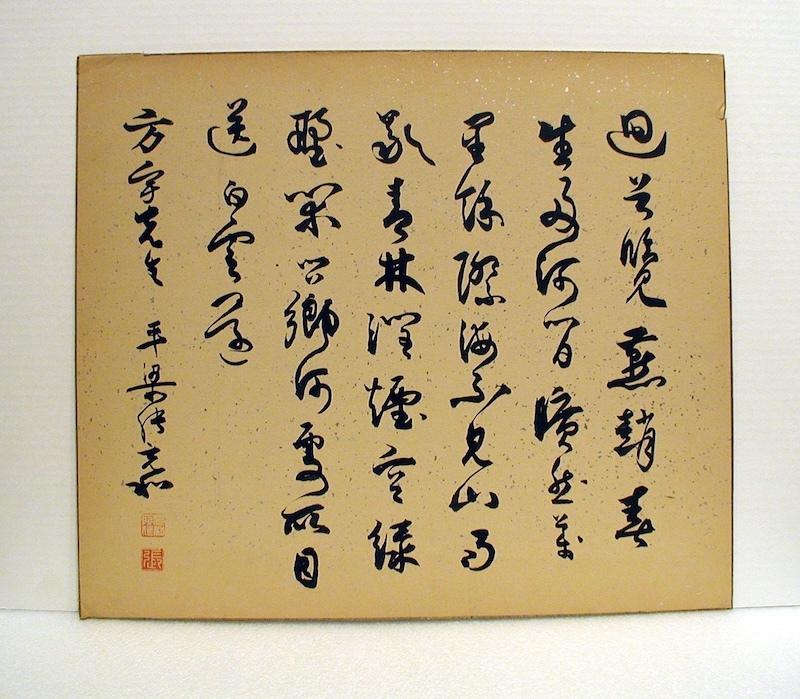 我在耶鲁美术馆访学期间,主要负责整理馆藏中国书画资料。在美术馆的收藏中,有两件充和先生的书法作品。一件是她本人于1993年捐赠之物,尺寸为36 x 41 cm,已装框,从右至左用篆书、楷书、行书和草书四种书体书写“寻云相伴归”五字,没有签名和印章,看来似乎是一件为学生示范的作品。“寻云相伴归”源自北宋王安石五言绝句《山中》,全诗为“随月出山去,寻云相伴归。春晨花上露,芳气著人衣。”全诗营造出超脱尘俗和清新幽远的意境。作品书法追寻古意,特别是楷书“寻”字横画的收笔和“云”字下面撇折断开的写法,无不流露出魏晋书风的意蕴。另一件是王方宇夫妇捐赠的作品,约写于1960年代。这件尺寸为36 x 42cm,用浓墨写在洒金笺上,神采非凡。字体为小草,写的是唐代崔湜的五言律诗《冀北春望》:“回首览燕赵,春生两河间。旷然万里余,际海不见山。雨歇青林润,烟空绿野闲。问乡何处所,目送白云还。”后署:“方宇先生,平梁张充和。”下面钤印两方,“充和所作”及“张”。充和先生在和她弟弟张宗和的通信中,谈到唐代孙过庭《书谱》,还谈到日日临习贺知章《孝经》(参看《一曲微茫——充和宗和谈艺录》)。她的这件小草书,能感受到晋唐书法的风骨,笔势连绵又显得典雅匀停,有些字有章草的意韵,如“逥”字和“送”字的“辶”旁捺画都向上收笔,是章草的写法。