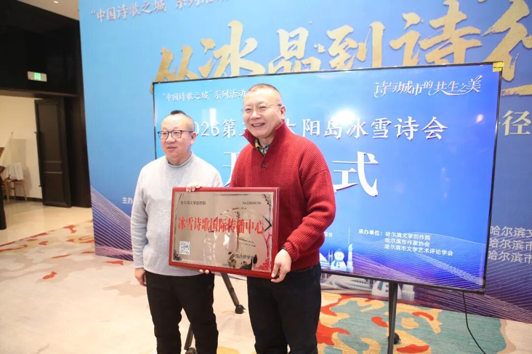 授牌仪式环节,中国诗歌学会社会活动部主任马文秀宣读“冰雪诗歌国际传播中心”授牌文件,中国诗歌学会常务副会长兼秘书长王山为哈尔滨文学创作院正式授牌。这一荣誉既是对哈尔滨冰雪诗歌创作传播成果的高度认可,更为冰雪文化走向世界搭建了重要平台。随后,吉狄马加发表讲话并宣布诗会开幕,并现场为此次活动写下“中国诗歌之城哈尔滨”题词,正式拉开了这场文化盛宴的序幕。