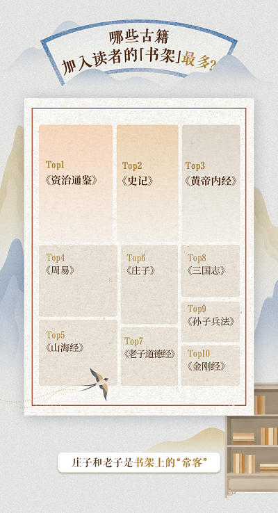 2025年4月,识典古籍App上线,支持用户在手机查看古籍并使用各项功能,进一步提升了阅读便利性。报告显示,App内《资治通鉴》《山海经》《黄帝内经》成为最受读者喜爱的古籍,排名第一的《资治通鉴》每天有近千名读者阅览。同时也是每日被读者加入“书架”最多的古籍,《庄子》《道德经》等也成为读者“书架”上的常客。