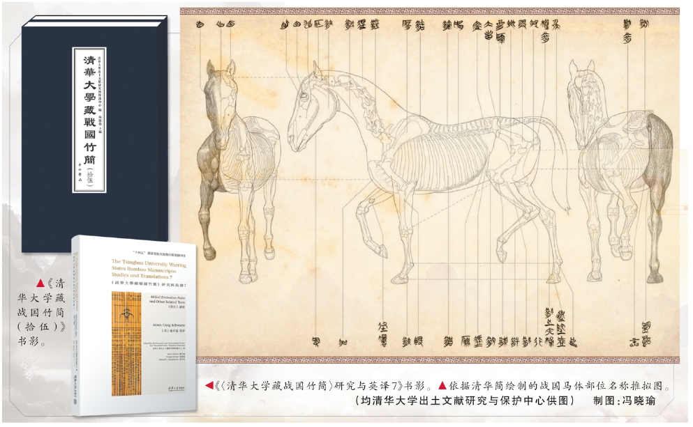 《清华大学藏战国竹简(拾伍)》书影。《〈清华大学藏战国竹简〉研究与英译7》书影。依据清华简绘制的战国马体部位名称推拟图。(均清华大学出土文献研究与保护中心供图) 制图:冯晓瑜