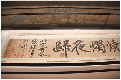 “元祐风华”展区是整场展览的高光。这里复刻了北宋“西园雅集”的风雅场景,宋五大名窑的瓷器、古朴的青铜彝器、玲珑玉琴错落陈列,仿佛能听见当年苏轼、黄庭坚、米芾等名士诗文唱和的欢声笑语。核心展品草书《浣花溪图引》卷作为黄庭坚现存最早的草书作品,结字中宫紧凑,笔势纵逸洒脱,笔法多骨少肉,可窥见其晚年草书的某些特征。“黄庭坚是宋代书法顶级大师,其书法思想成熟深刻,大字行楷书独树一帜,这是他位列宋四家之一的重要原因。”黄庭坚诗书画院院长、书法家黄君说。