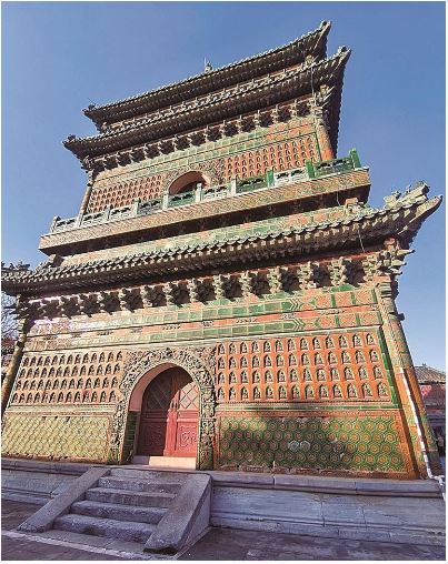 记者看到,琉璃阁以黄绿为主色调,有二层,上层为重檐歇山顶,上下层皆为绿琉璃瓦顶。资料显示,琉璃阁立面上镶嵌着1424尊无量寿佛琉璃像,是全国少见的清代官式琉璃建筑。院落中的七佛塔亭内,八角石塔上刻着七世佛和乾隆御笔所书《七佛塔碑记》,全国仅此一例,展现了中国古代建筑的高超技艺与工程智慧。记者注意到,琉璃阁一层的佛像头在历史上遭到损毁,二层则保留较为完整,尤其是琉璃拱门周边装饰的大鹏鸟等藏传佛教中的装饰,姿态和神情都清晰可见。七佛塔亭为重檐八角形,隔着玻璃向里看,能隐约看到一座高大的八角形石塔。