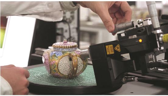 四把壶的分析检测被列入实验室最高级别项目,所有的分析检测设备排期都要优先满足它们的检测需求。按照连夜做出的研究方案,我们对四把壶的金属胎体先进行了元素成分检测,这样的检测工作与常规的科学检测不同,因为存在很大的限制,不能对文物造成损伤是首要前提。正常的取样在文物研究中都是可遇而不可求的奢望,所有的检测都强调在无损的情况下进行,实验室利用X射线荧光光谱技术得到了四把壶的金属成分结果。结果显示其中三把壶都是红铜做胎后在表面再鎏了一层金,而那把被证明是法国工匠制作的壶其实是一把纯金的壶,档案中关于其铜胎的记载将被改写。