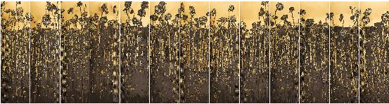 许 江:我们这一代人的成长与改革开放是同步的,我们既是亲历者、受惠者,也是创造者。首先是大学恢复招生,我们走进了大学。记得1979年那个冬天,中国美术学院的校领导把买汽车的钱省下来,买了100多本外国画册,用“展览”的方式,每一天翻一页,分享给全校师生。那时,每天早晨我们都在窗口期待着翻页老师的出现,他翻过一页,把门打开,我们就像潮水一样拥进去观看,“原来这是毕加索,这是塞尚”,我们就这样如饥似渴地吸收着来自世界的讯息。我们这一代人还经历过“洋插队”“土插队”,上山下乡,让我看到中国农村的发展;出国留学,又让我看到了我们与西方的差距,所以从事艺术创作之后,我尝试过很多方向,抽象绘画、装置艺术、综合材料等,实验探索的路也很长,而最终我回到了我们的家园。2003年,当我跟随中国美术学院的考察团在亚细亚平原上看到跟大地一样颜色的葵园屹立在夕阳中,像一群老兵在等候最后一道军令时,我深受感动。那一片葵园,不仅唤起我们这一代人自己“向阳花开”的时代记忆,也让我感受到人生的众多况味,感受到天苍苍、野茫茫的莽原气象。从这个意义上,我发现了葵,从此便奔向了葵园,不断地画葵,画葵就是画我们这一代人、画我们自己、画我们的理想与青春记忆。所以,我画的葵又多是复数的葵、群体的葵。一幅画面上时有一二百个葵头聚集在一起,就像一个“人”的广场、聚集了人民的广场。一片片葵园聚成了一个个葵的交响、人的交响、一代人的交响。面对不同的葵园,我就好像面对不同的生命现场。比如,在浙江海盐,我画过台风肆虐后大片抱团倒伏的群葵和其中依然昂然挺立的残葵。在我眼中,那是奋斗的、团结的群雕,是不懈努力的英雄主义的生命剧场;在内蒙古巴彦淖尔,我在黄河岸边,被一眼望不到边的几万亩葵园完全震撼,当地人告诉我,那里就是地图上黄河“几”字形的拐弯处,母亲河环抱着大地与万亩葵园,那种博大、那些现场,每次回想起来都让我深深为之感动。所以,在我的笔下会有红色的葵园,深秋里,熟透的秋葵的叶子像刀一样伸向天空,非常美,也非常苍凉。我把葵画成了红色,把红土地也画成了心中的红色,就像整个大地烧熟了,整个葵园也烧熟了一般,展现出一种壮烈的独有的景象与意蕴。