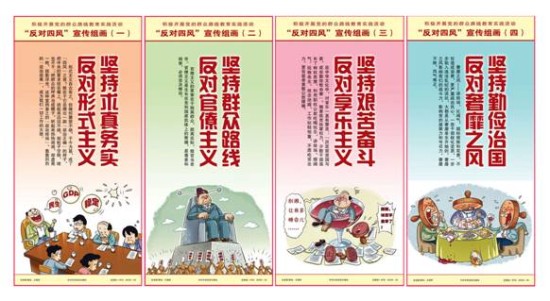 由著名军旅书法家,解放军某部大校王福军策划创意的《积极开展党的群众路线教育实践活动,反对“四风”宣传组画》日前由中共中央党校出版社 正式出版发行。全党深入开展以为民务实清廉为主要内容的党的群众路线教育实践活动,是党的十八大作出的重大决策。这次教育实践活动的主要任务聚焦到作风建 设上,集中解决形式主义、官僚主义、享乐主义和奢靡之 风这“四风”问题。这“四风”是违背我们党的性质和宗旨的,是当前群众深恶痛绝、反映最强烈的问题,也是损害党群干群关系的重要根源。中央党校出版社出版 的《积极开展党的群众路线教育实践活动,反对“四风”宣传组画》 正是根据中央这一精神,用通俗的形式把反对“四风”问题展现出来。全套组画共4幅,分别是:持求真务实,反对形式主义;坚持群众路线,反对官僚主义;坚持 艰苦奋斗,反对享乐主义;坚持勤俭治国,反对奢靡之风。