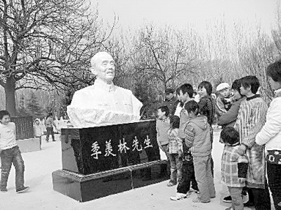 | 季羡林憩园位于临清市康庄镇大官庄村,附近村民在此瞻仰季老塑像 |