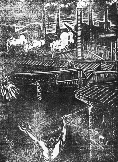 这一幅构图很稳妥,浪费的刀也几乎没有。但我觉得烟囱太多了一点,平常的工厂,恐怕没有这许多;又,《汽笛响了》,那是开工的时候,为什么 烟通上没有烟呢?又,刻劳动者而头小臂粗,务须十分留心,勿使看者有“畸形”之感,一有,便成为讽刺他只有暴力而无智识了。但这一幅里还不至此,现在不过 偶然想起,顺便说说而已。
