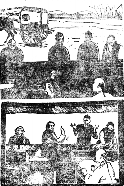 《孔乙己》的图,我看是好的,尤其是许多颜面的表情,刻得不坏,和本文略有出入,也不成问题,不过这孔乙己是北方的孔乙己,例如骡车,我们那里就没有,但这也只能如此,而且使我知道假如孔乙己生在北方,也该是这样的一个环境。