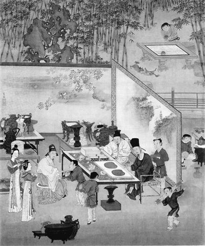 《竹林品古图》,仇英绘,《南华录》插图。 |