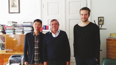本文作者(左)和联系人、斯语翻译LukaGolez(右)在matica出版社德拉戈·扬察尔办公室与其合影。