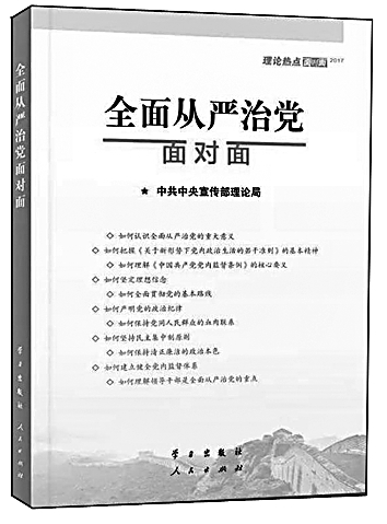 治国必先治党,治党务必从严。党的十八届六中全会审议通过了《关于新形势下党内政治生活的若干准则》和《中国共产党党内监督条例》,对全面从严治党作出战略部署,开启了全面从严治党的新征程。为深入学习宣传贯彻全会精神,近日,由中宣部组织编写的2017年通俗理论读物《全面从严治党面对面》与大家见面了。该书紧密联系党的十八大以来全面从严治党实际,针对管党治党的新形势新任务,深入浅出地解读阐释,主题突出,说理透彻,文风清新,读起来催人奋进,是生动诠释全面从严治党的精彩之作。
