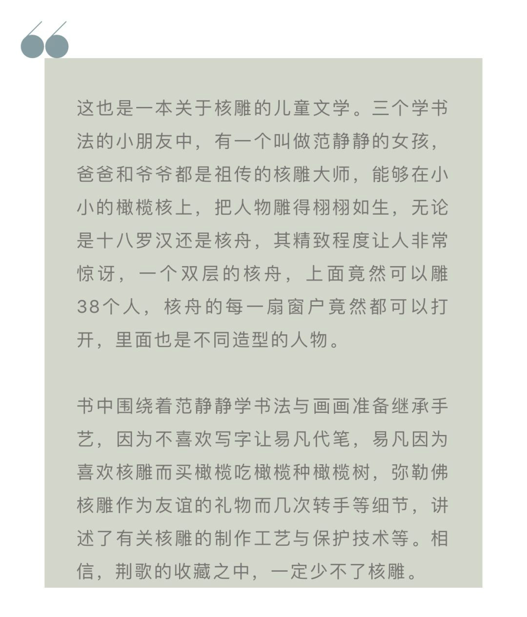我是在从北京到广州的飞机上一口气读完这本小说的。作为在苏州生活了30年的人,我自然不仅仅把它当做儿童文学来看。我觉得,这是一本关于苏州、关于江南文化的儿童文学。除了书法,核雕,这本书中还有苏州园林,还有苏州美食(朱鸿兴面,生煎包等),苏州的民居,苏州的小巷等等。甚至,在读这本书的时候,我脑海中浮现的是许多苏州的人、事、景。
