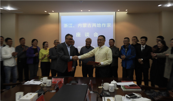 活动期间,浙江省作协和内蒙古自治区作协互赠图书并签订了《浙江省内蒙古自治区两地作协友好合作协议书》。