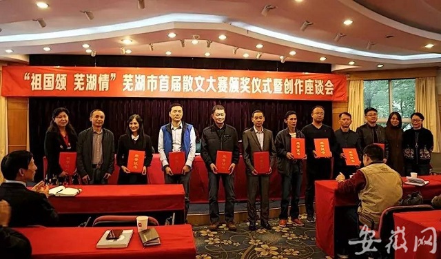 记者从安徽省作协获悉,“祖国颂 芜湖情”芜湖市首届散文大赛颁奖活动暨创作座谈会日前在芜湖举行。安徽省散文随笔学会会长潘小平、安徽省散文随笔学会名誉会长沈天鸿、芜湖市文联秘书长林征宇、此次散文大赛获奖者、芜湖散文创作骨干及芜湖市作协主席团部分成员等40余人参加了此次活动。