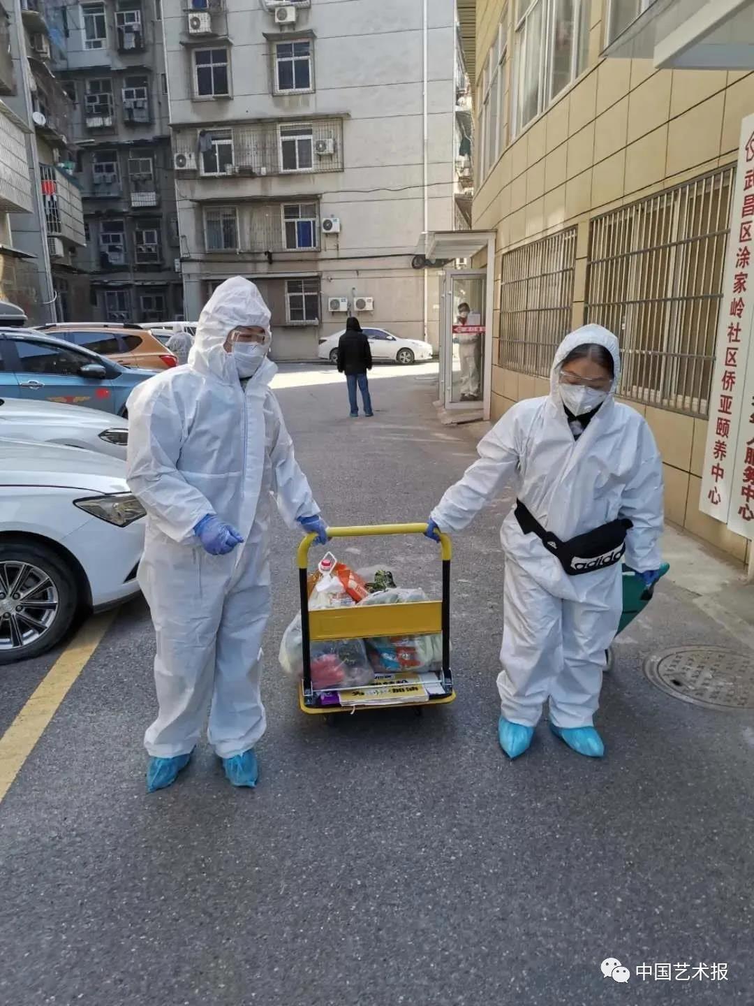 湖北省文联“党员进社区工作队”队员周玲和陈冬梅为居民送生活物资