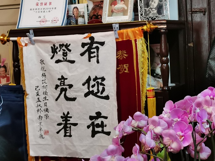 杨先生家住在一楼。叩门进入,百年的光阴遽然涌来:丈夫赵瑞蕻、哥哥杨宪益的照片挂在一进门就能看到的地方,清癯的面孔、柔和的光影描绘着一代知识分子的独特风貌,还有由南京师范大学颁发的该校“2019年度十位年度人物”荣誉证书,写着“有您在,灯亮着”的巨幅生日赠语,书法家俞律书写的“成鬼容易成佛少,作诗容易作人难”“岂有豪情似旧时,花开花落两由之”对联,几乎占据整整两面墙的密密匝匝的书籍,以及沙发上一字排开的憨拙丑萌的毛绒玩具……杨先生安详地坐在客厅一隅的一张椅子上,体态清瘦,和人交谈时眼神专注明亮,说话思维清晰、不掩锋芒。