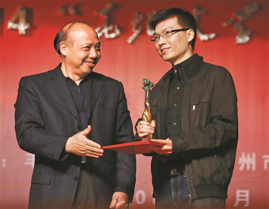 蒋述卓(左)向花地文学榜获奖者陈楸帆颁奖 郑迅 摄
