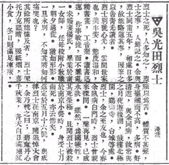 吴光田(1907-1927),江苏松江县人,早年就读于东吴第四高小,后进入江苏省立第三中学,肄业一年转入南京东南大学附属中学,毕业后考入东南大学政治经济系。1927年3月15日,他因从事进步活动被直鲁联军逮捕,3月17日在南京小营英勇就义,被追认为烈士,松江、南京等地召开了追悼会。陈梦家于1922年7月升入东南大学附中,与吴光田同窗五载,常与之相交游,因而对其家世、爱好、性格等方面皆有所了解。1927年初春,吴光田曾探望病中的陈梦家,此次见面竟成永诀。他被杀害时,陈梦家正在上海,感于至友为国捐躯,遂写下此文,将所知烈士事迹介绍给读者。他为追悼会写有挽联,寄托哀思。1932年,陈梦家在《十六年夏前后(二)》中追忆:“有一位同学吴光田,他是一位又美又温柔的青年,就在那时候被奉军砍死。”(《北平晨报·北晨学园》1932年10月31日第四〇五号)仍对好友的早逝感到惋惜。