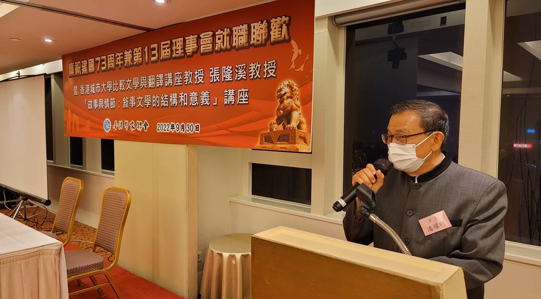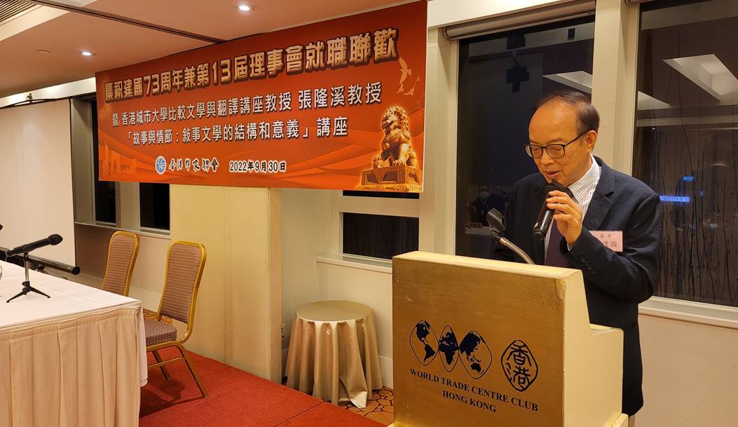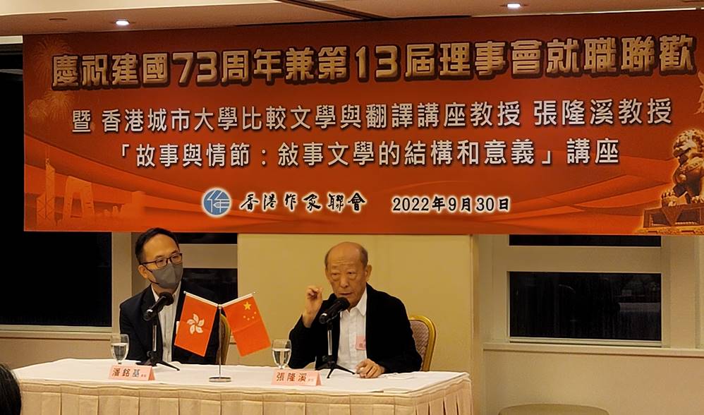 9月30日,香港作家联会在香港世贸中心举行庆祝建国七十三周年兼第十三届理事就职联欢晚会,香港城市大学比较文学与翻译讲座教授张隆溪应邀主讲《故事与情节:叙事文学的结构和意义》。中国文学艺术界联合会香港会员总会会长马逢国、常务副会长林天行,香港中国通讯社总编辑黄少华,明报报业集团有限公司董事甘焕腾、营运总裁高志毅,作联永远名誉会长贝钧奇、江扬等出席,近百位与会人士以文会友,相聚交流。