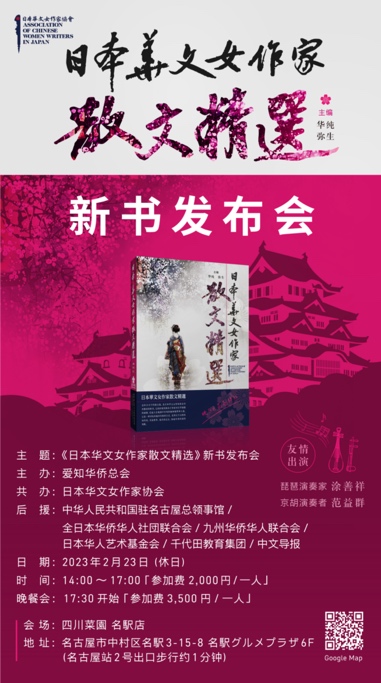 2月23日,作为主办方的爱知华侨总会将在名古屋举办“《日本华文女作家散文精选》新书发布会”,后援单位有中华人民共和国驻名古屋总领事馆、全日本华侨华人社团联合会、九州华侨华人联合会、日本华人艺术基金会、千代田教育集团和中文导报社等。详情请见新书发布会的海报,欢迎文学爱好者报名,共同推动华文文学创作再接再励。