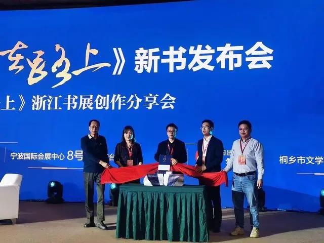 现场,华文出版社总编辑余佐赞、桐乡市文联副主席吴赟娇、作者欧阳伟、凤鸣街道党委委员邱俊、桐乡市高速公路服务区行业协会代表叶佳春共同为本书揭幕。