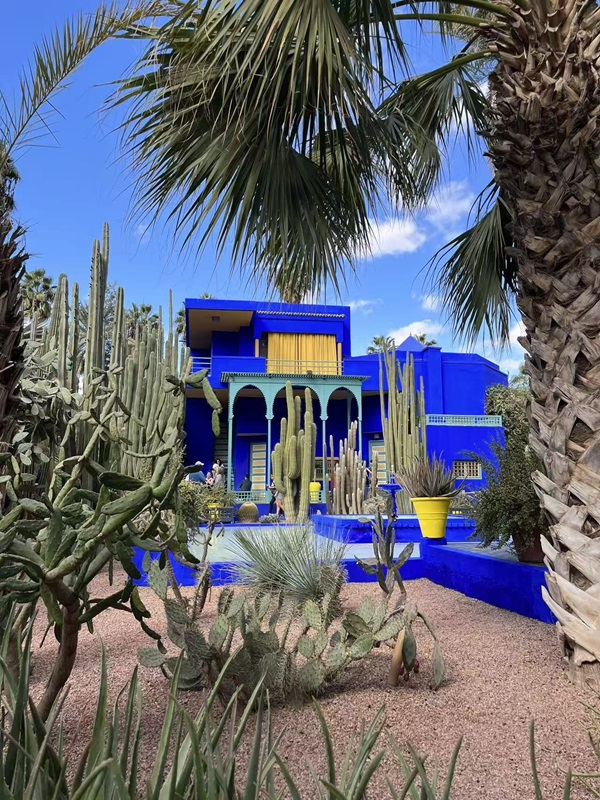 1966年,圣罗兰和同伴贝尔热第一次游历摩洛哥。摩洛哥这个国家,特别是马拉喀什这个城市,其鲜艳的色彩深深影响了圣罗兰,为他带去了很多灵感。当他在马拉喀什发现了马约尔花园时,立刻“被这片马蒂斯的色彩与大自然的色彩相融合的绿洲所吸引”。1924年,法国画家雅克·马约尔购得这块土地,并建造了一座花园。1980年,圣罗兰和贝尔热成为了这里的新主人,对花园进行了大规模的修复工作。画家雅克·马约尔的工作室被改造成一个面向公众开放的柏柏尔博物馆,展出圣罗兰和贝尔热的藏品。自1966年起,每年6月和12月,圣罗兰都会在马拉喀什度过两周时间,设计他的高定时装系列。2008年6月1日,圣罗兰因脑癌去世,享年71岁。贝尔热把圣罗兰的骨灰埋在了马约尔花园。距离花园不远处的圣罗兰博物馆于2017年对外开放,和巴黎的圣罗兰博物馆遥相呼应,共同纪念这位伟大的艺术家。漫步在马约尔花园,这种被命名为“马约尔蓝”的色调格外醒目,让游客以为来到了色彩斑斓的梦幻天堂。