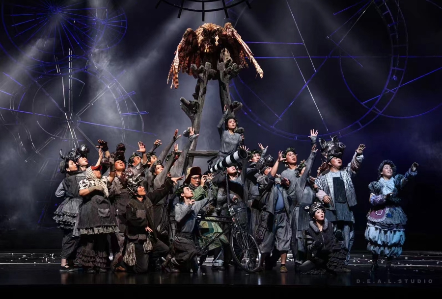 他们的创造是全方位的,编导演、舞美、音乐合流,每一个细部,都充满了寻常意义上的不确定性。比如对星空的表现,最后立到舞台上的“布景”,竟然没有一颗星星,全是乡场上那些水磨、轮盘等农具的“机械式”精密组装。我立即表示认同,这不正是对宇宙抽象、概括而本质的理解吗?浩瀚宇宙,不正是一个“万有引力”的精密组合体吗?另外就是观测,观测让我们知道了星空。因此,观测,才是艺术家们在戏里的着力点,星空就“留白”给想象力了。