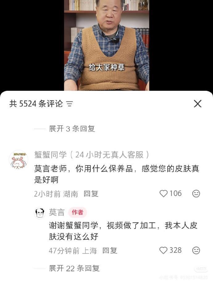 还有网友问:莫言老师,您用什么保健品,感觉您的皮肤真是好啊。莫言回复:谢谢,视频做了加工,我本人皮肤没这么好。