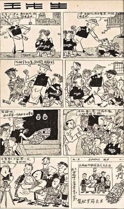 1934年,具有明星潜质的“王先生”形象,被上海天一影片公司老板邵醉翁慧眼识得,改编拍摄了滑稽电影《王先生》,一夜蹿红。此后,影坛连珠炮似的涌现了11部系列影片,诸如《王先生的秘密》《王先生过年》《王先生吃饭难》《王先生奇侠传》《王先生夜探殡仪馆》等,后期的影片基本脱离了漫画,但沿用原作的人物关系,插科打诨,荒诞不经,越编越离谱。
