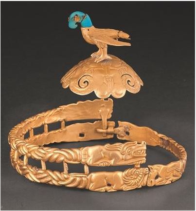 战国时期鹰顶金冠饰。