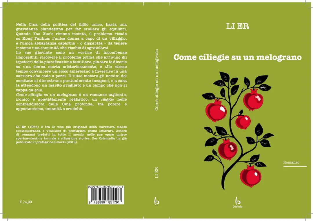 2025年《石榴树上结樱桃》意大利语版也问世。这次的封面采用了深绿色作为主色调,给人一种自然、朴实、甚至带点沉静的感觉。它与石榴的红色形成鲜明对比,同时也赋予了画面一种有机的、泥土的气息,与农村背景相呼应。同时,画面中心是一棵具有木刻版画风格的石榴树。木刻版画在现代中国是一种非常重要的艺术形式,常被用于民间艺术、年画和宣传画,甚至1930年代兴起的木刻运动也成就了左翼美术运动的主要风格。[25]这些视觉构图传达出农村、左翼、民间等元素,并且呈现一种更具艺术性和经典感的设计。虽然书名有“樱桃” 两字,但画面上结的是红色的石榴果实。这是一个非常有趣且关键的设计选择。它似乎回避了英文版那种轻盈而荒诞的视觉构图,而是选择了一种更为内敛、象征性的表达。不过,跟英文版一样,设计者在红色石榴里面暗藏了婴儿的图案。整体而言,意文版的封面更像是一个艺术典藏品。