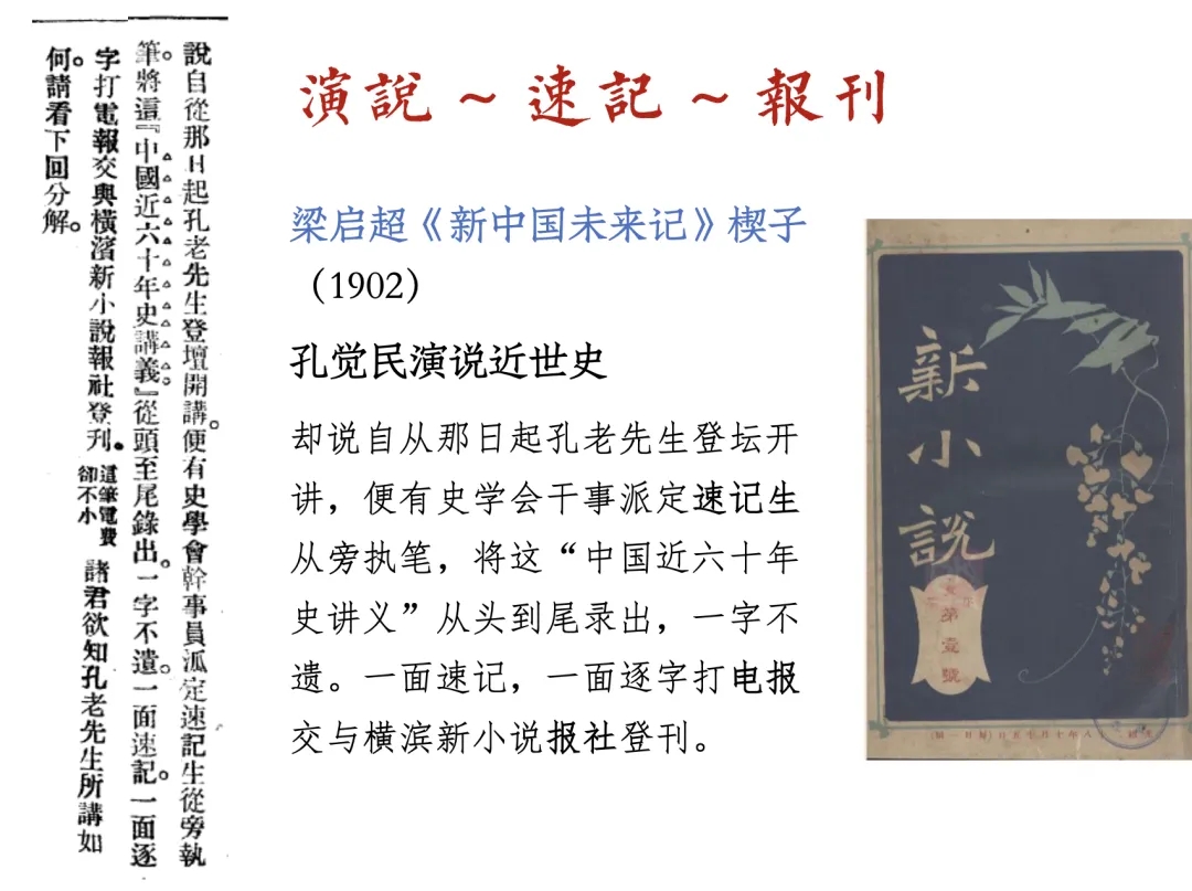 1902年梁启超在《新小说》创刊号上发表《新中国未来记》,速记作为演说的配角悄然登上历史舞台。小说第一回设置的场景是维新五十周年庆典,在上海召开大博览会,“处处有演说坛,日日开讲论会”。博览会场中央是京师大学校文学科史学部举办的讲座,邀请全国教育会会长孔觉民演说“中国近六十年史”: