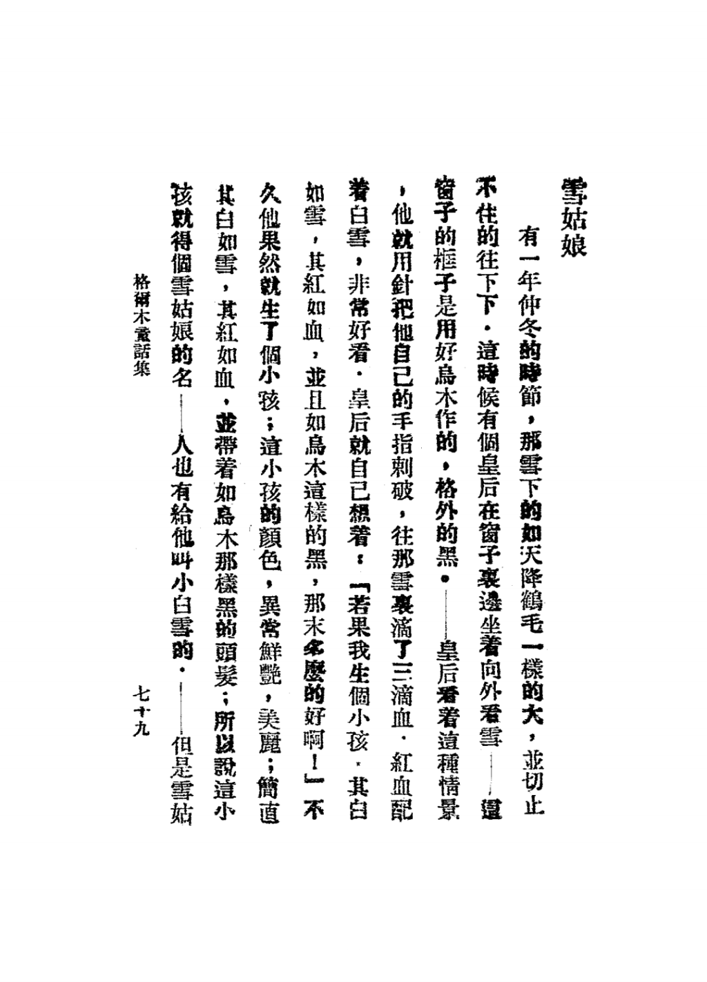 《时谐》专栏连载完后又曾单独结集(商务印书馆,1914年),足见在当时很受读者青睐。不过这种译笔所预设的读者,绝不会是略识之无的幼童。有出版者对此就颇不以为然,直言“这是儿童很大的不幸”(《上海开明书店出版新书·德国民间故事集》,载《文学周报》第六卷,1928年)。然而此事又谈何容易,在文言译本问世多年以后,更适合儿童阅读的白话译本,如王少明译《雪姑娘》(收入《格尔木童话集》,河南教育厅编译处,1925年),高君箴译《魔镜》(收入郑振铎、高君箴合译《天鹅》,商务印书馆,1925年),坚白译《雪姑娘》(载1926年第44期《晨报副刊·家庭》),刘海蓬、杨钟健合译《白雪娃》(收入《德国童话集》,古城书社,1928年),康元白译《古怪的镜子》(收入《新时代小学生丛书·童话》中册,广益书局,1933年),魏以新译《雪白儿》(收入《格林童话全集》,商务印书馆,1934年)、谢颂义译《白雪公主》(收入谢颂羔编《格列姆童话选》,广学会,1939年)、林俊千译《白雪公主》(收入《格林姆童话》,鸿文书局,1941年)、张亦朋译《白雪公主》(收入《格林童话全集》,启明书局,1949年)、丰华瞻译《白雪公主》(收入《格林姆童话全集》之四《白雪公主》,文化生活出版社,1952年)等才陆续问世。有些译本在介绍原作者时,或称“格尔木”,或作“格林姆”,或云“格列姆”,与日后相沿成习的译名“格林”均有出入,而另一些译本干脆将原著情况略过不提,好在覆按主要故事情节,应该都本自格林版童话。
