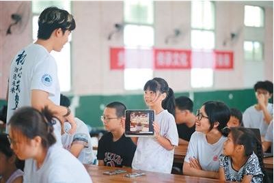 湖南省怀化市通道侗族自治县万佛山镇木脚村,大学生在给孩子们上趣味AI实验课。