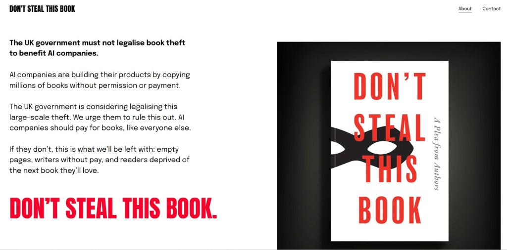 包括诺贝尔文学奖得主石黑一雄在内的约1万名作家共同创作了一本空白书《不要偷走这本书》(Don’t Steal This Book),这本书的唯一内容是所有参与此项目的作家名单。3月10日开始的伦敦书展上,这本书的拷贝被分发给参加书展的人士,以抗议人工智能未经授权使用他们的作品。