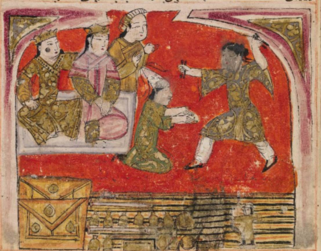 博德利安手稿中的插图,描绘秦国士兵追捕萨玛克、秦国公主玛赫帕里以及她的侍女