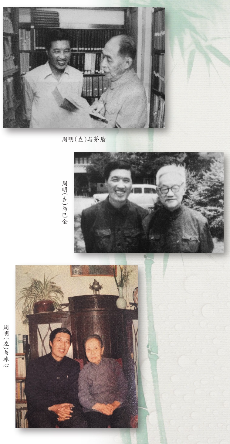 第一,记述与文坛大家的交往故事,以精彩的细节和难忘的镜头,回放了一帧帧令人难忘的场景,描绘了他们各具个性的精神风采和令人难忘的光彩形象。《人民文学》资深编辑的特殊身份、长于交往的性格,使得周明从20世纪50年代以来,与茅盾、巴金、冰心、赵树理、张光年、李季、柳青等当代文坛大家有较多的接触与来往。他在散文作品中,忠实地还原了历史场景,生动地再现了当时的情景。如《茅盾与〈人民文学〉》等文章,记述了《人民文学》复刊之后,他去给茅盾呈送新出的刊物时,茅盾谈起毛泽东主席当年为《人民文学》创刊题词的情形。他还在茅盾家里看到茅盾珍藏的毛泽东主席写给茅盾的亲笔信。在记述文坛名家的散文里,他写得最多的是冰心。文章以丰富而生动的细节,传扬出冰心不老的童心和内在的幽默。比如他与冰心交谈时说跟过去相比,冰心现在的文章有锋芒了。冰心随即回应说:“姜,自然是老的辣嘛!”在《冰心的晚年世界》中,他讲到冰心与许多文坛巨匠的关系,他们之间既相互惦记,也彼此调侃,友情深挚又充满情趣。