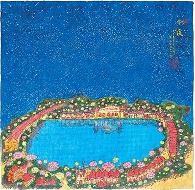 如果说《小夜曲》是黄永玉“我与你”的告白,那么《今夜》便是“我与世界”的宣言。画面中,湖畔宁静,繁星满天,万家灯火与绚烂烟花交相辉映,营造出一种平和而温暖的氛围。他在题跋中写道:“愿上天给人间每个人都有美好的今夜,天天如此,月月如此,年年如此,十年如此,百年如此。告诉子孙们,人应该拥有如今夜之权利,过宁馨如今夜之日子。”