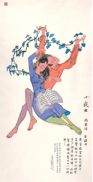 《小夜曲》是黄永玉的最后一幅作品,创作于2023年5月。当时,他脑海中反复回响着78年前与妻子张梅溪相识时哼唱的一首法国老歌——《古诺小夜曲》。家人找到了这首歌曲的五线谱与歌词,黄永玉便以此为灵感创作。画中一对青年男女依偎而坐,男子手持缠绕成心形的叶子藤蔓,女子膝上摊开曲谱,背景朦胧如月夜,题写着歌词片段:“黄昏后,当你在我怀中柔声歌唱……”黄永玉曾说:“我们在孩提时代的梦中早就相识,我们是洪荒时代在太空互相寻找的星星,我们相爱已经十万年。”在他生命旅程的最后时光,这首曲子被反复播放,陪伴他走完人生旅程。