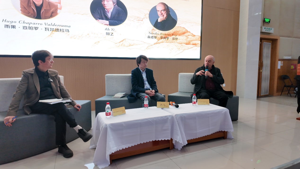 2026年4月14日,哥伦比亚作家雨果·查帕罗·瓦尔德拉马、桑德罗·罗梅罗·雷伊来到首都师范大学,与作家阿乙围绕“中哥作家笔下的青年命运与时代症候”进行对谈,来到现场的还有首都师范大学和古城中学的学生,古城中学的学生还献上了精彩的西语表演。该活动由中国作协对外联络部、五洲传播出版社、首都师范大学联合主办。