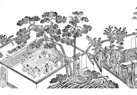 明代还有个特殊的流杯亭——“桌上曲水流觞”。当时著名的戏剧家汪廷讷于万历年间在安徽休宁建坐隐园,其名取自“坐隐手谈”之意,既暗合围棋雅趣,也寄托主人避世隐居、寄情山水的文人理想。在描述其园景的《环翠堂园景图》里,有“桌上曲水流觞”图,此曲水流觞并非自然溪流,也不是刻于地面上的水槽,而是将曲水的自然景观微缩于桌案之上,在方寸之间重现兰亭风骨,是明代文人将生活艺术化的极致体现。
