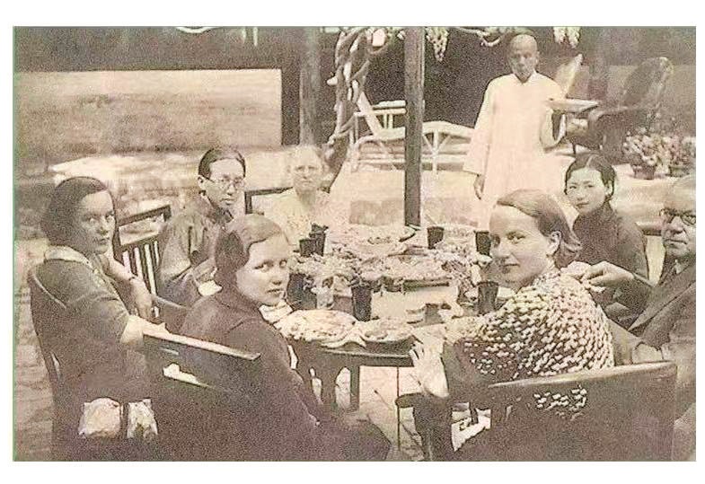 “一九三五年四月二十三日,林徽因,梁思成(左二)与费慰梅(右三)及其家人在北平。”