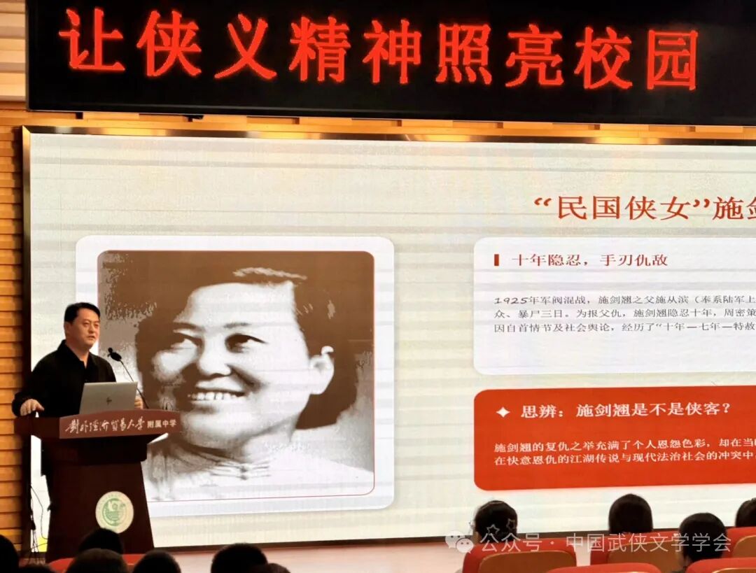 4月21日,由中国武侠文学学会与对外经济贸易大学附属中学(高中部)联合举办的“让侠义精神照亮校园”主题讲座隆重举行。此次活动作为中国作家协会“文学浸万家”阅读推广活动的重要组成部分,旨在通过解读武侠文学作品,引导莘莘学子理解并践行“一诺千金诚为本,侠骨热肠义为先”的优秀传统侠义精神。