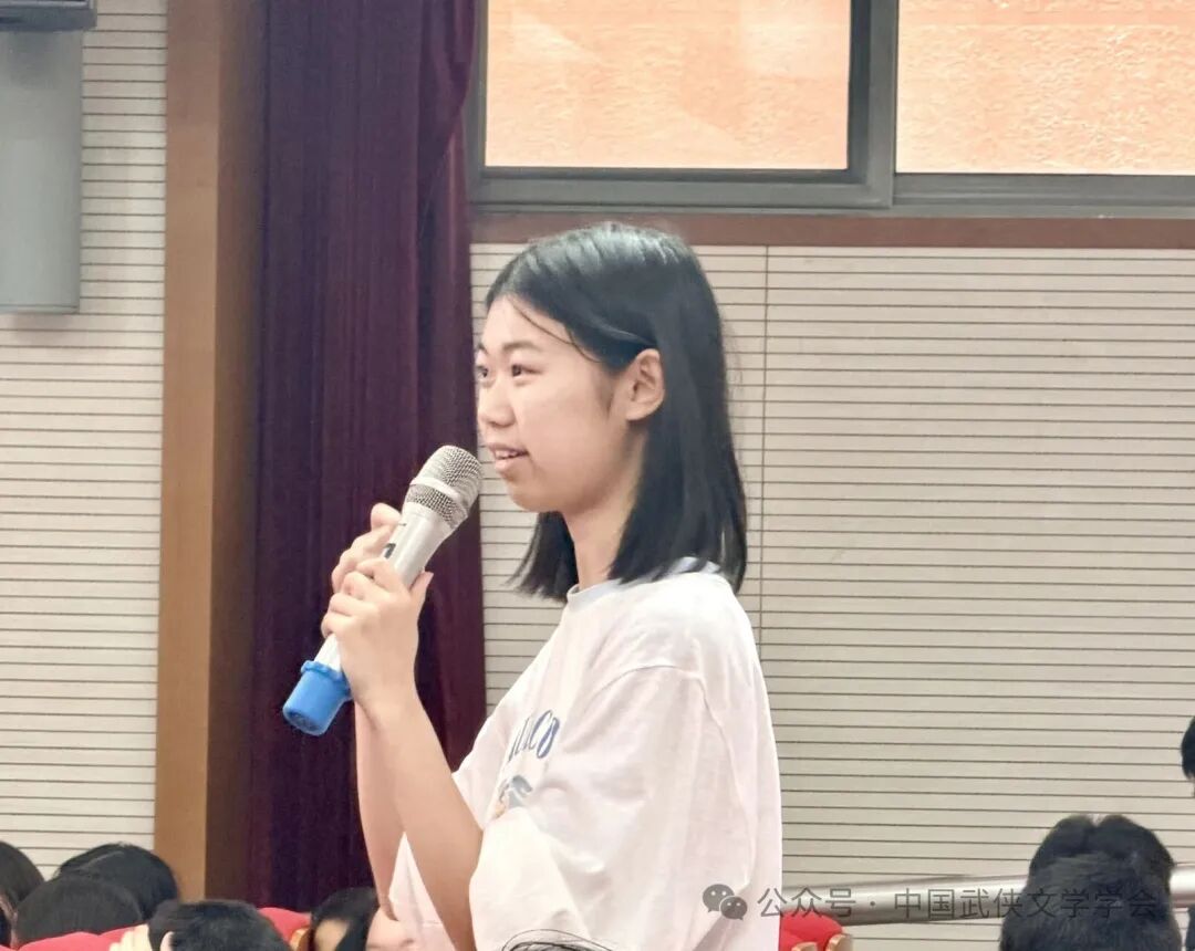 在随后的互动环节,现场气氛热烈。同学们踊跃提问,问题涵盖了“如何在现代校园中践行侠义精神”、“金庸小说对写作的帮助”以及“如何看待武侠文化中的悲剧色彩”等。