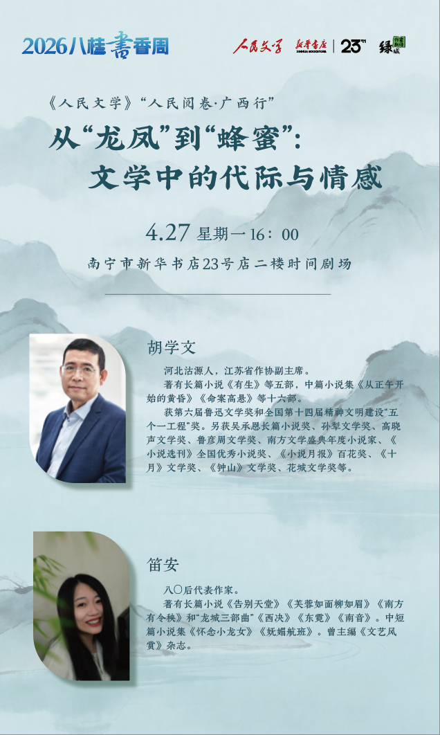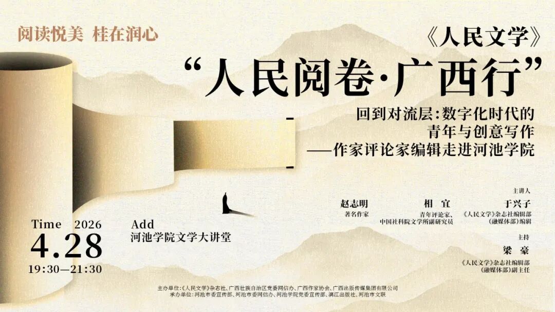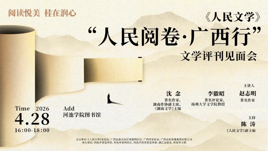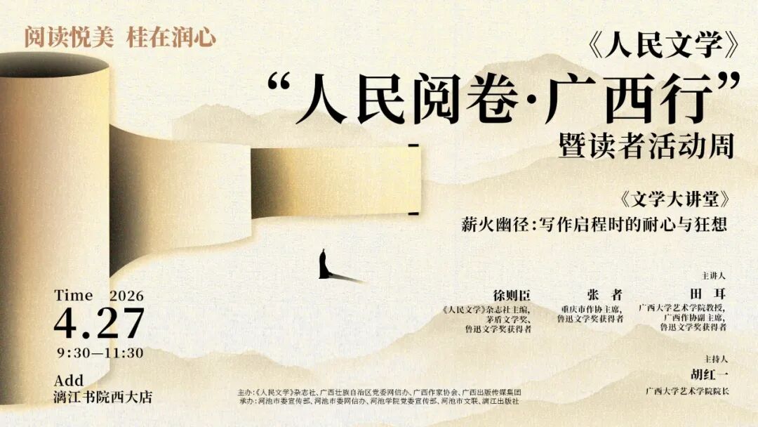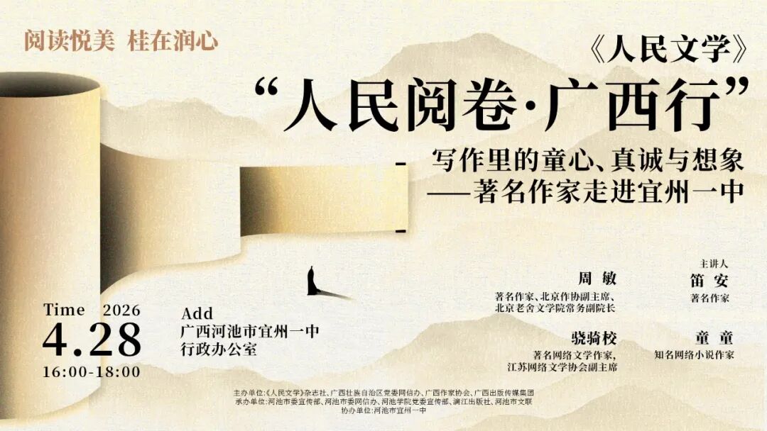 4月26日—29日,《人民文学》“人民阅卷·广西行”暨读者活动周将在南宁、河池两地举办。陈建功、徐则臣、陈涛、张者、胡学文、周敏、沈念等全国文坛名家齐聚八桂,带来跨越双城的文学盛宴。