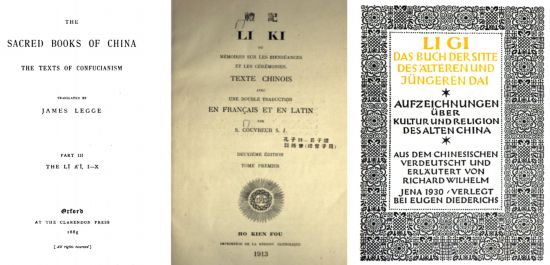 进入20世纪,西人对《礼记》的译介代表是德国汉学家卫礼贤(Richard Wilhelm,1873 -1930),卫氏希望“通过翻译、讲座和出版的方式,在东西方文化之间架起一座桥梁”。在其逝世前翻译的最后一部中国经典即《礼记:大戴礼记和小戴礼记,古代中国的文化宗教记录》(Li gi: das buch der sitte des älteren und jüngeren Dai; aufzeichnungen über kultur und religion des alten China,1930),也是迪德里希斯出版社的“中国宗教和哲学”丛书的收官之作。卫礼贤借鉴了前人的翻译实践,提供了理雅各译本和顾赛芬译本的对应编号,他将译本分为九部分,按照自己对“礼”的理解打破了原本的顺序,并根据主题将翻译进行了重新组织,其中包括对《礼记》章节的摘译,但更重要的是他几乎完全翻译了《大戴礼记》,从而补充了中国礼仪经典的内涵。同样地,英国汉学家翟理斯(Herbert Allen Giles,1845-1935)和林语堂也曾在各自著作中翻译了《礼记》的若干章节,尤其是林氏的节译标志着现代中国学者开始投身于《礼记》的西传。